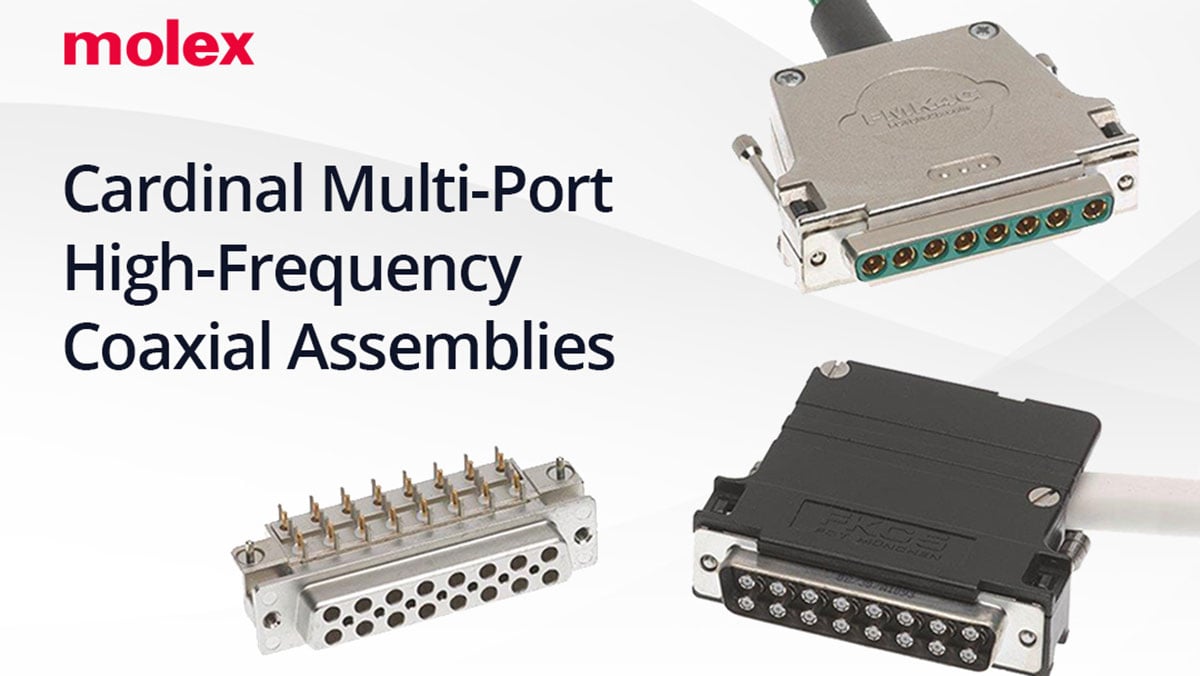 Molex Cardinal Multi-Port High-Frequency Coaxial Assemblies are available now, with the Cardinal 145GHz assemblies joining the existing lineup of 67GHz Precision Coaxial Assemblies and 110GHz Precision Coaxial Assemblies. Cardinal assemblies also offer versatile connector options, including vertical, right-angle and edge-mount PCB terminations, along with scalable, multi-port configurations, including 1 x 4, 1 x 8 and 2 x 8 for high-density setups.